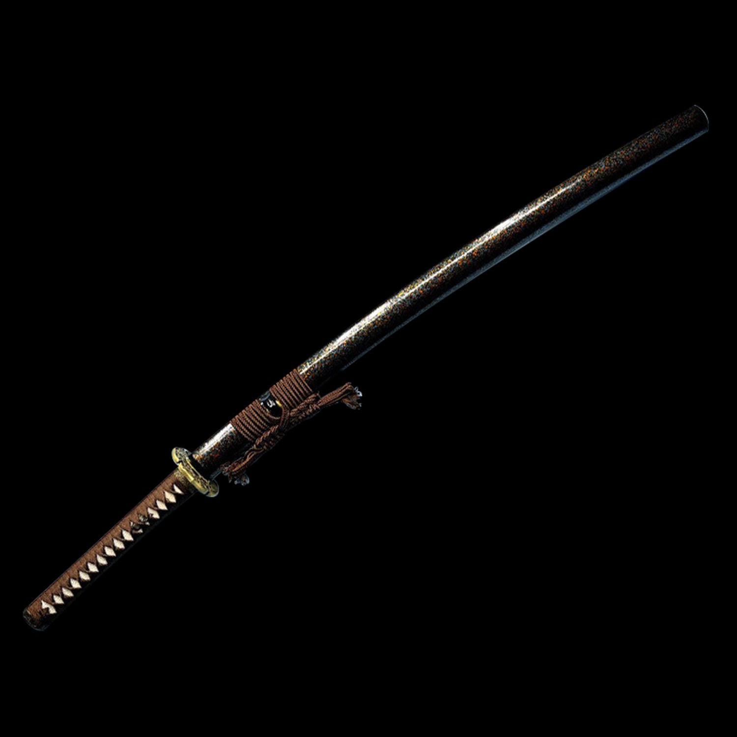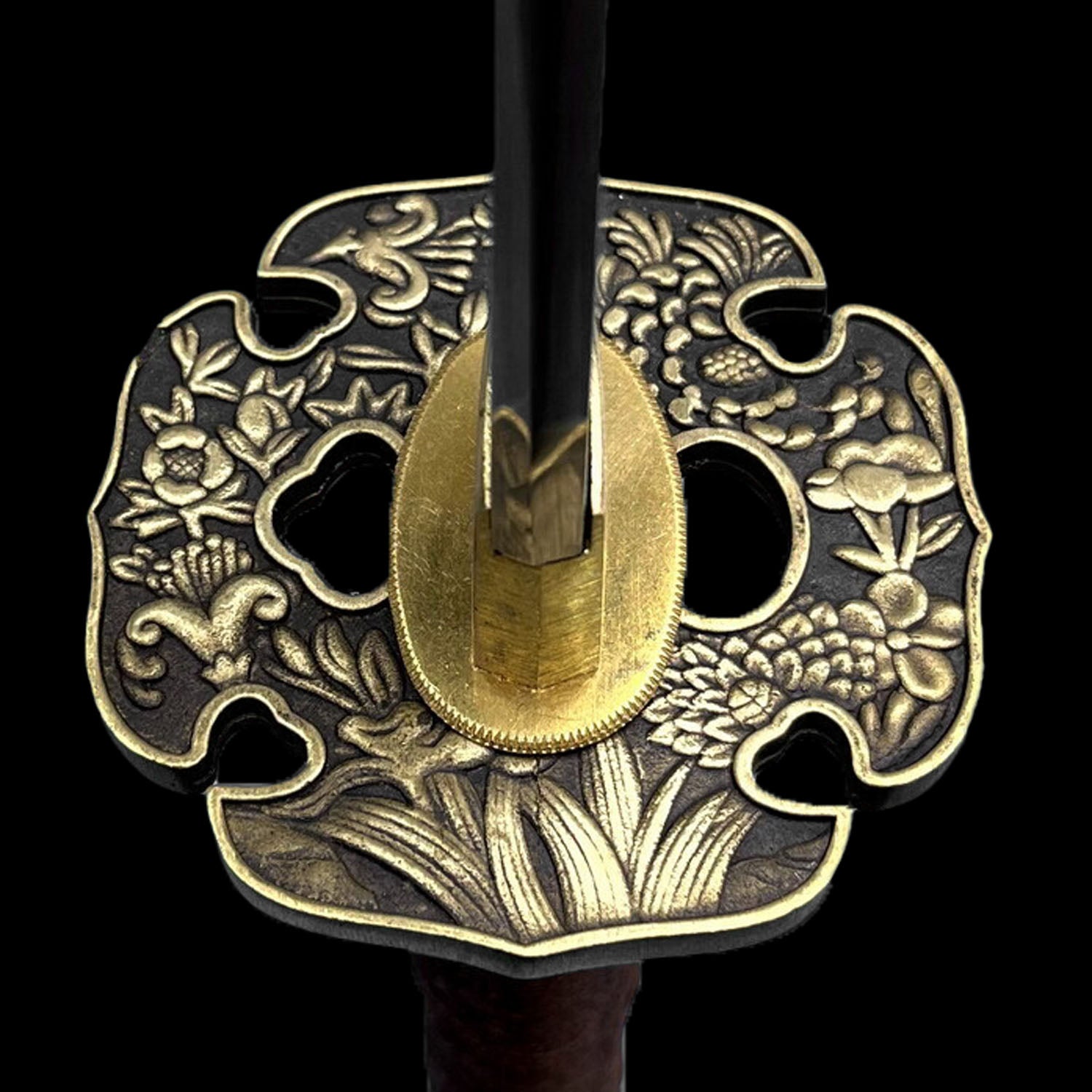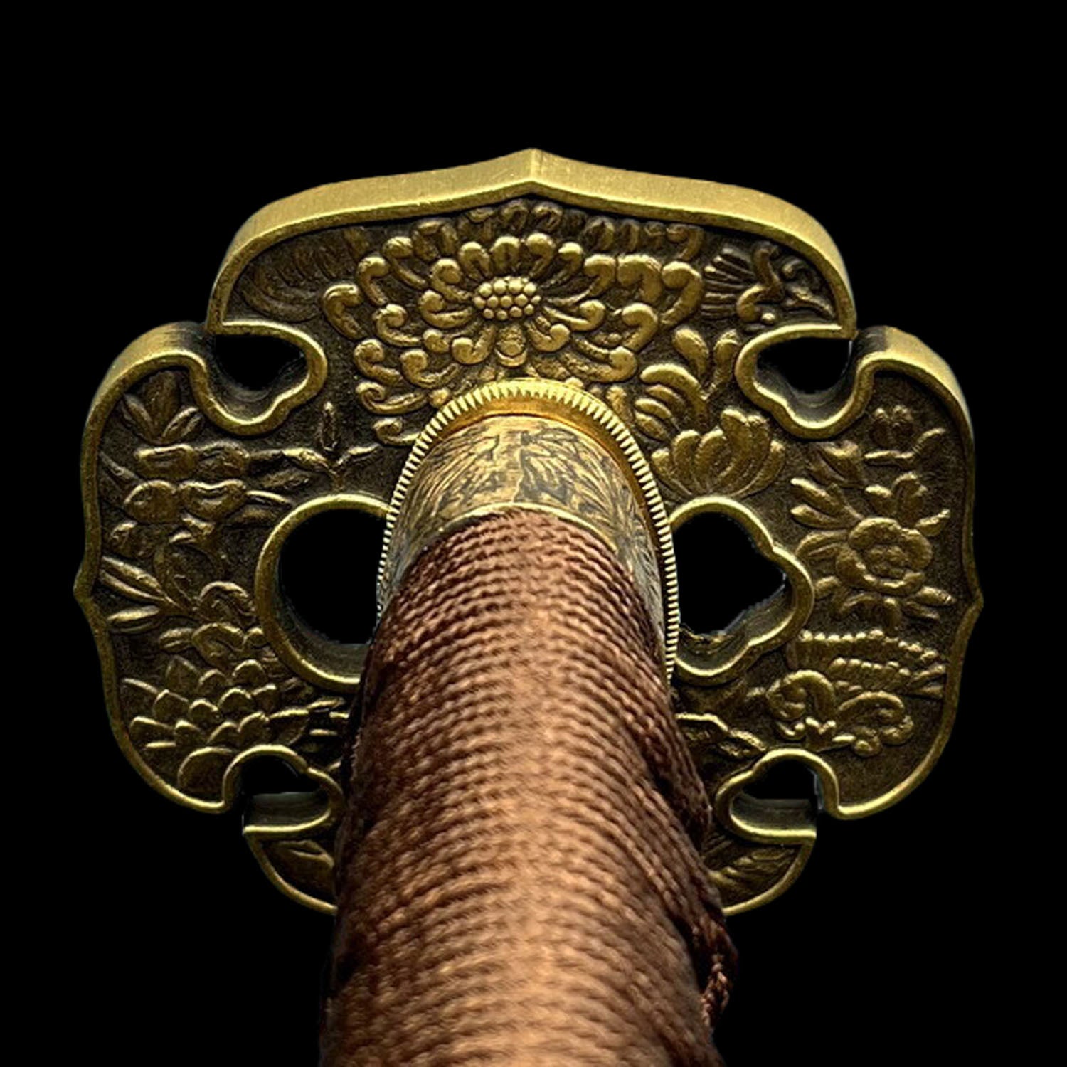 The fittings, including the guard, fuchi, kashira, and menuki, are crafted from quality cast brass.