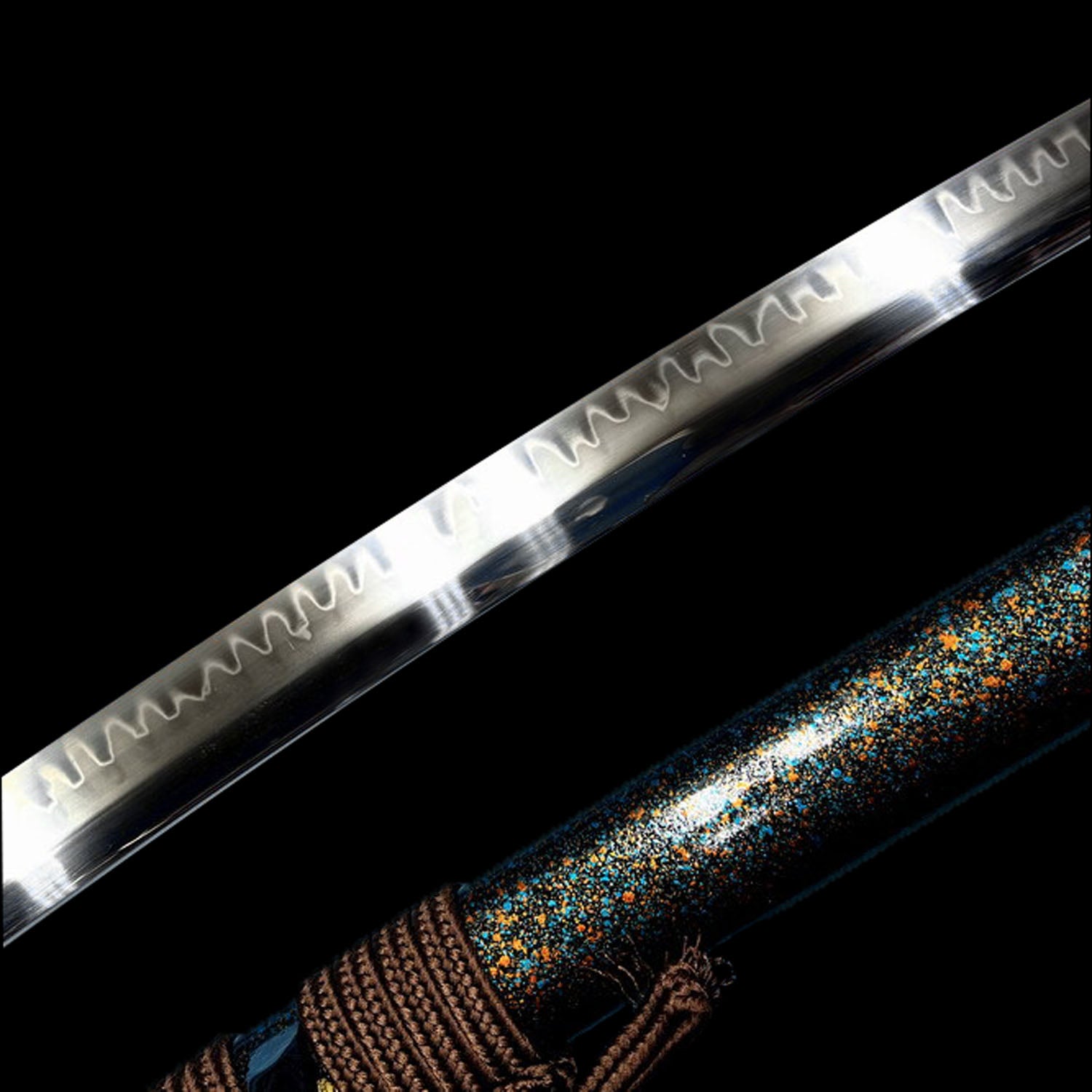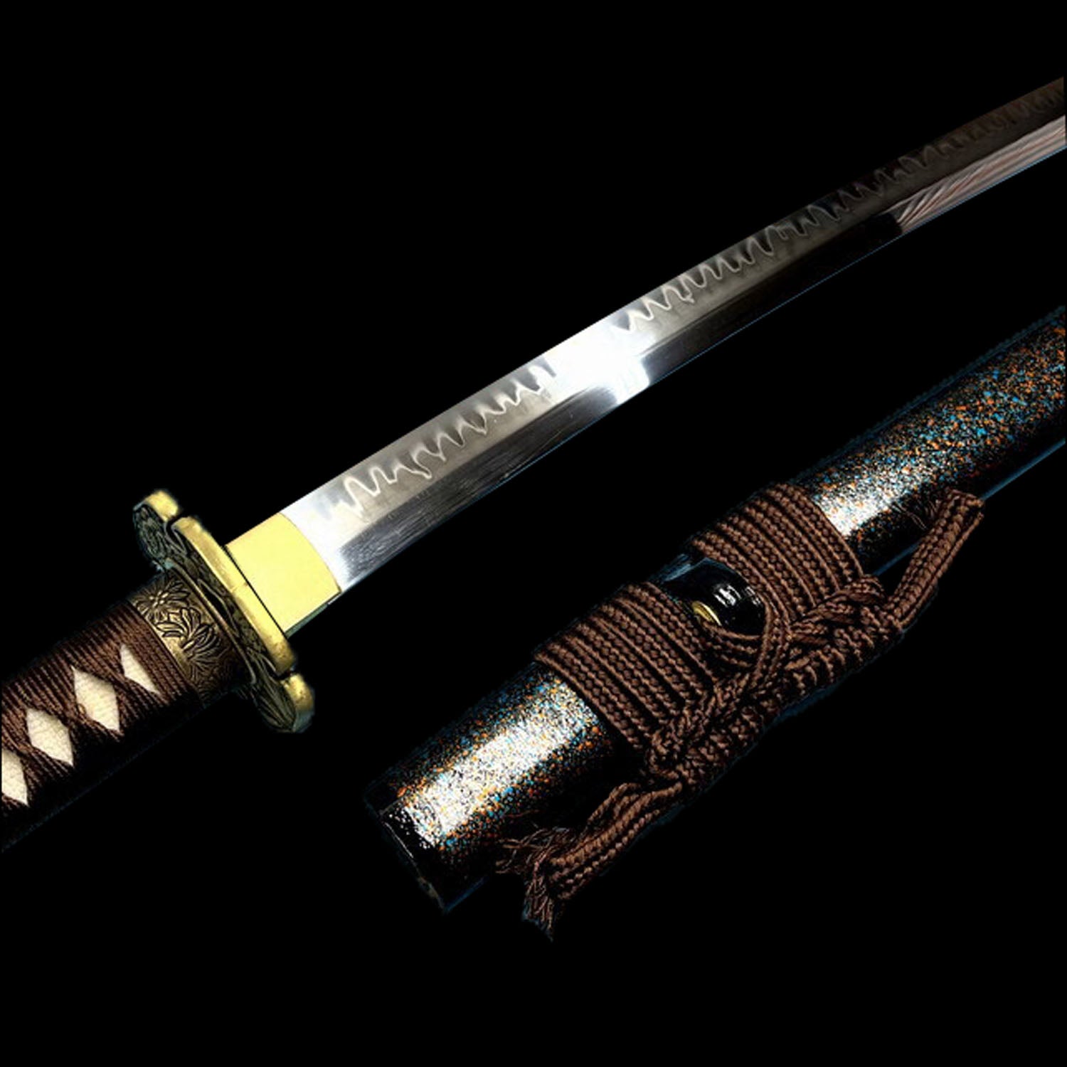 The blade is traditionally hand-forged with a differential clay-tempered hardening process, showcasing a Gunome-style hamon. It is hand-polished to achieve an authentic and refined appearance.