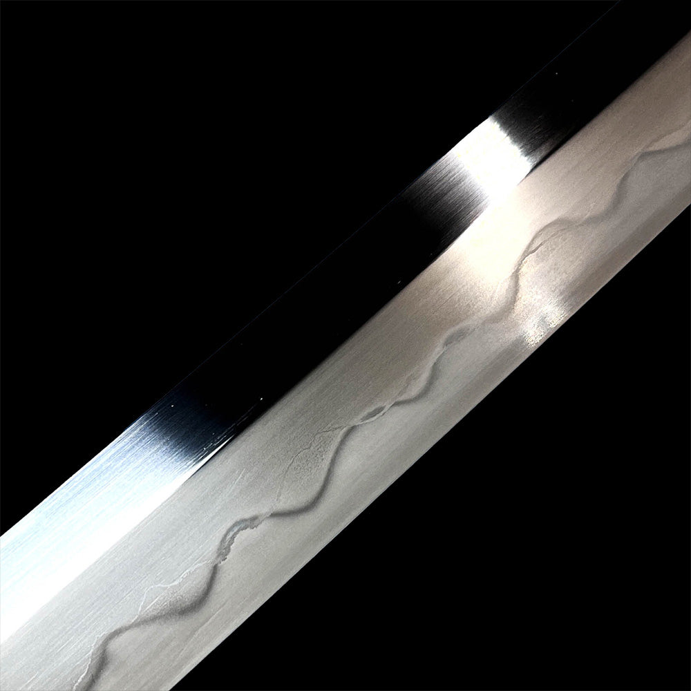 Traditionally forged Tamahagane steel blade, with Sanmai lamination and a differential clay-tempered hardening process. The Hazuya polish reveals a clear and striking hamon.