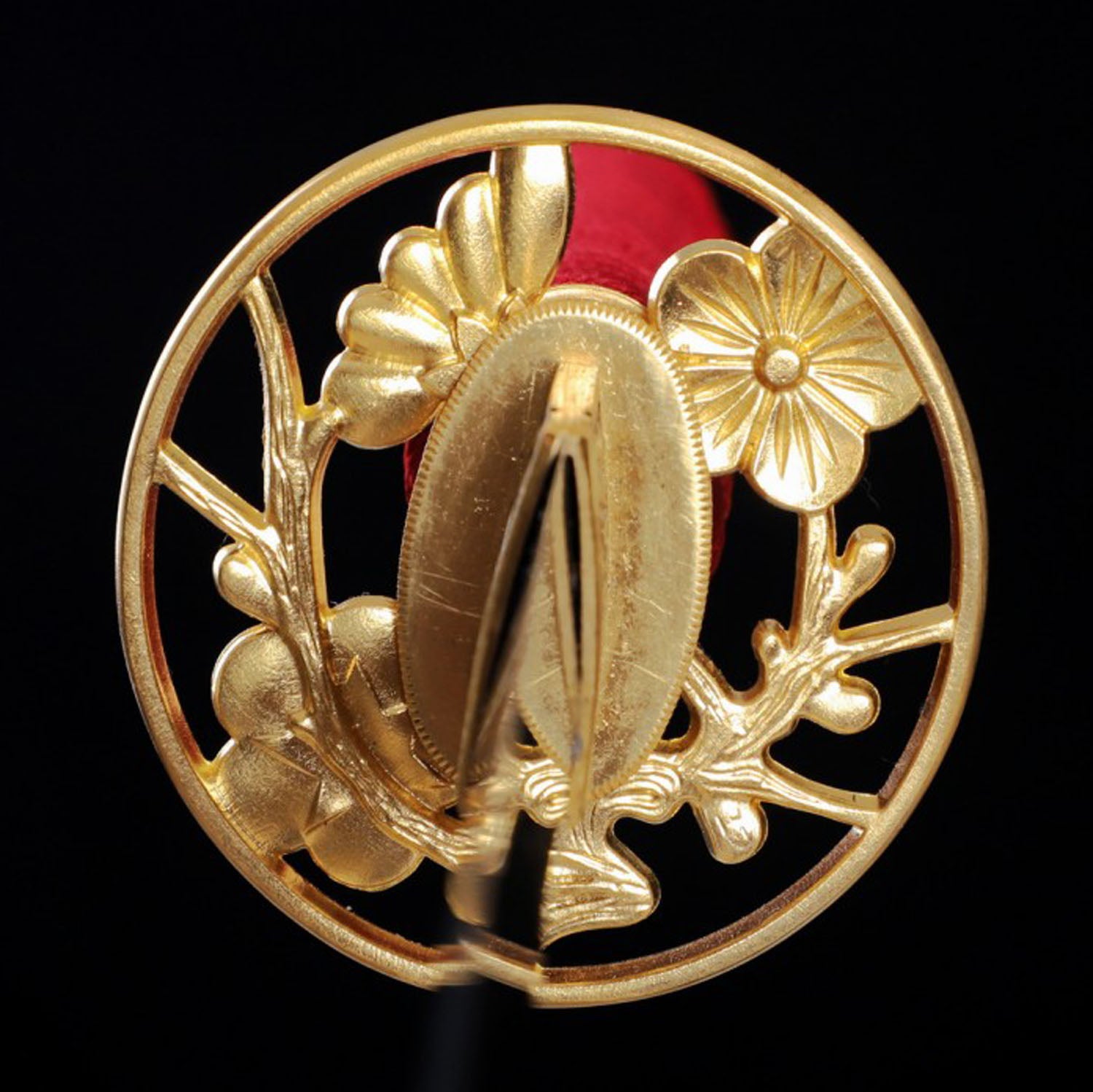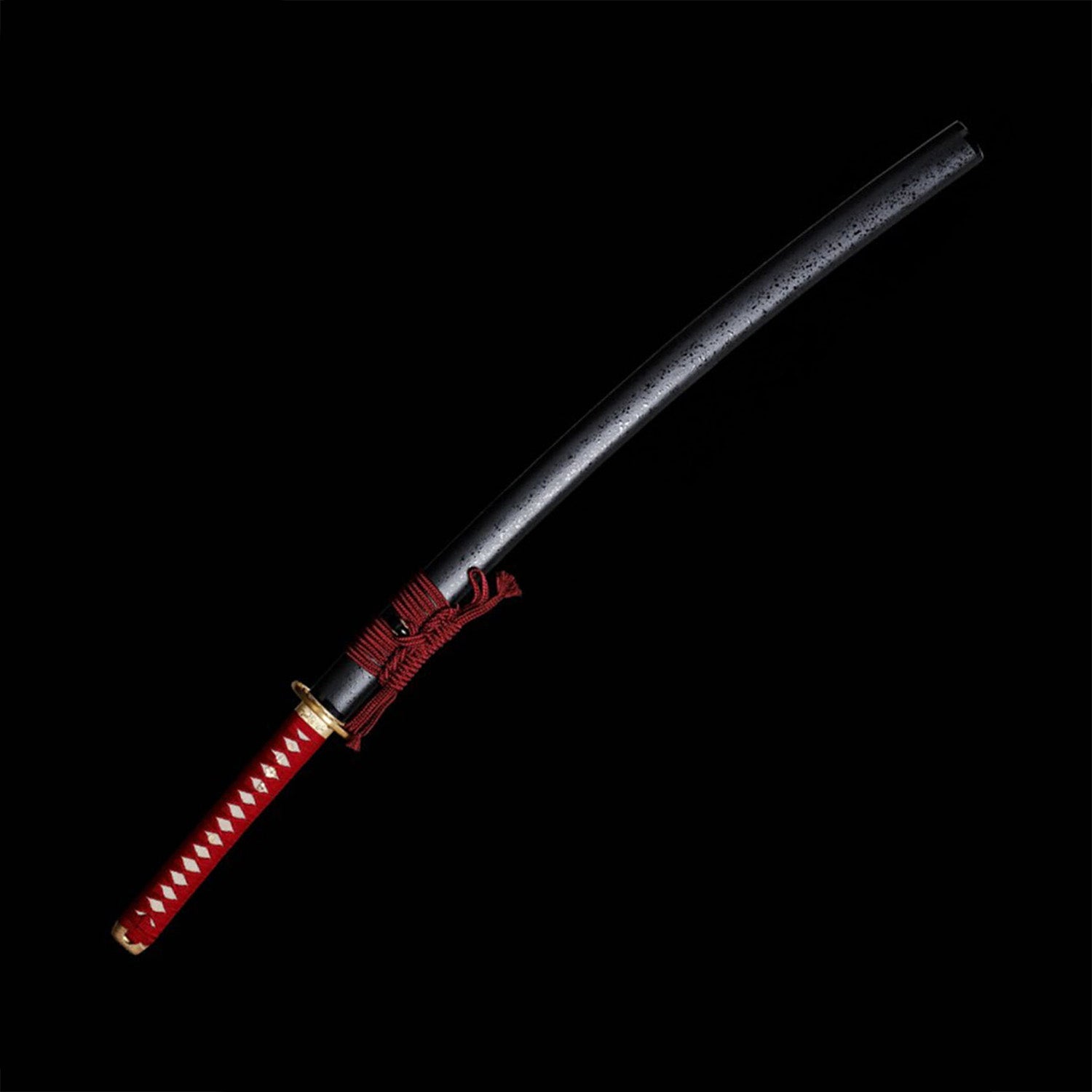 Hand-Forged Clay Tempered T10 Steel Katana with Red Tsuka and Floral Tsuba