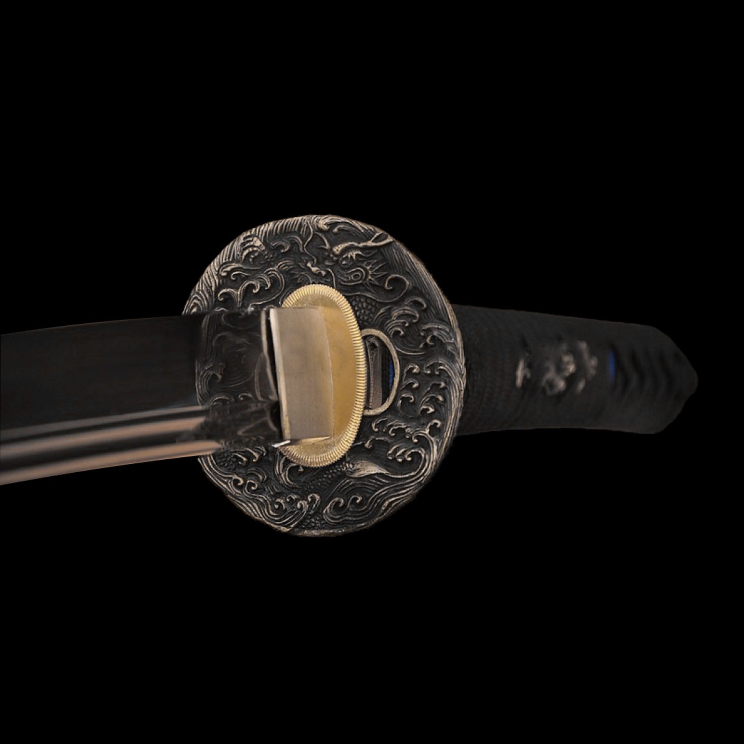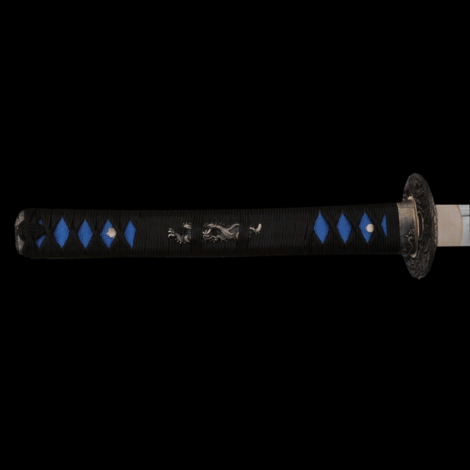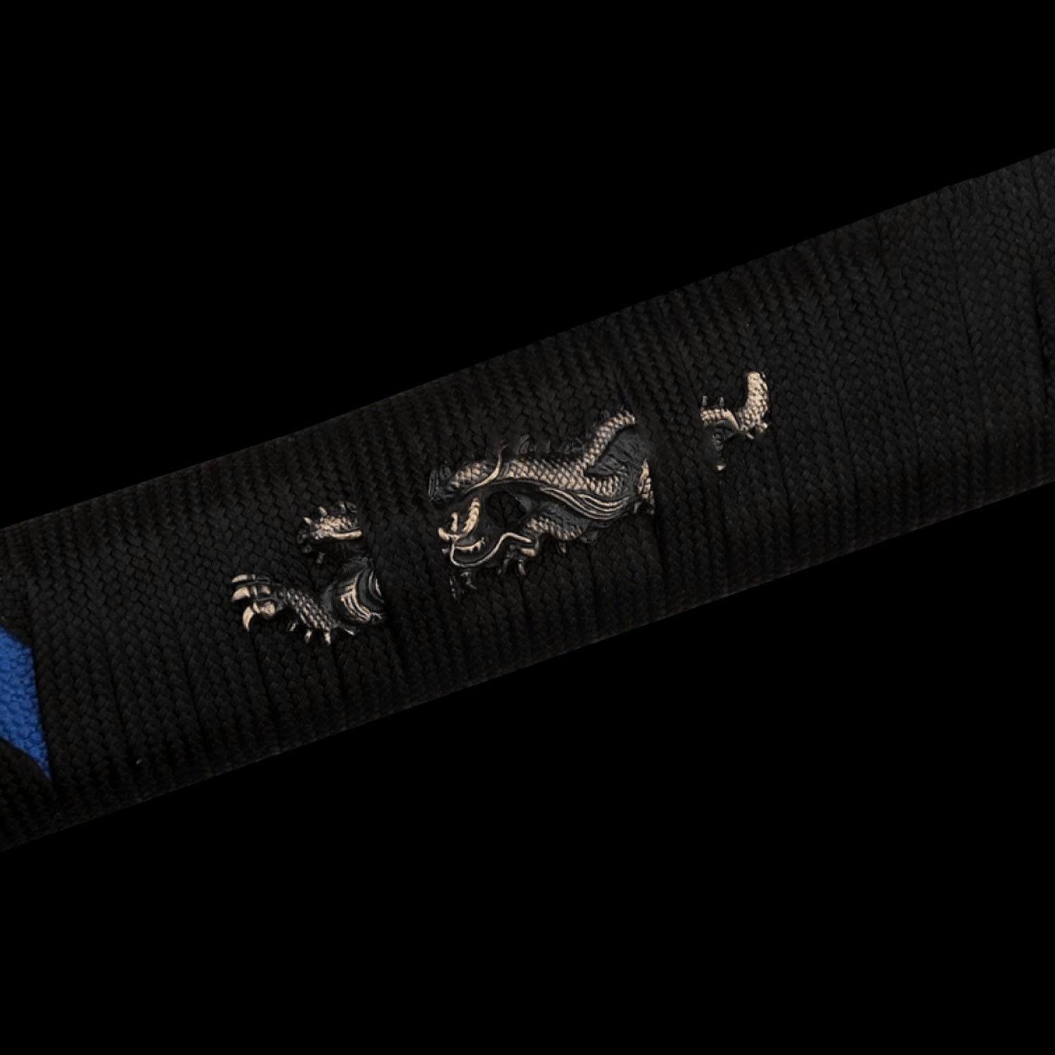 The Sea Dragon Katana features a 1060 high-carbon steel blade, fully hardened through oil tempering. The blade undergoes a meticulous 12-step hand-polishing process, creating a mirror-like surface. It is designed with long BO-Hi on each side, reducing weight and providing audible feedback when swung, while enhancing balance for optimal performance. The tsuka is tightly wrapped with black synthetic silk ito over blue genuine SAMEGAWA (ray skin), secured with double bamboo pegs. The menuki display a dragon motif, and the tsuba is a round, blackened alloy piece featuring a sea dragon design. The saya is finished in a stunning blue gloss that extends the full length of the scabbard, and the sageo is made of synthetic silk.