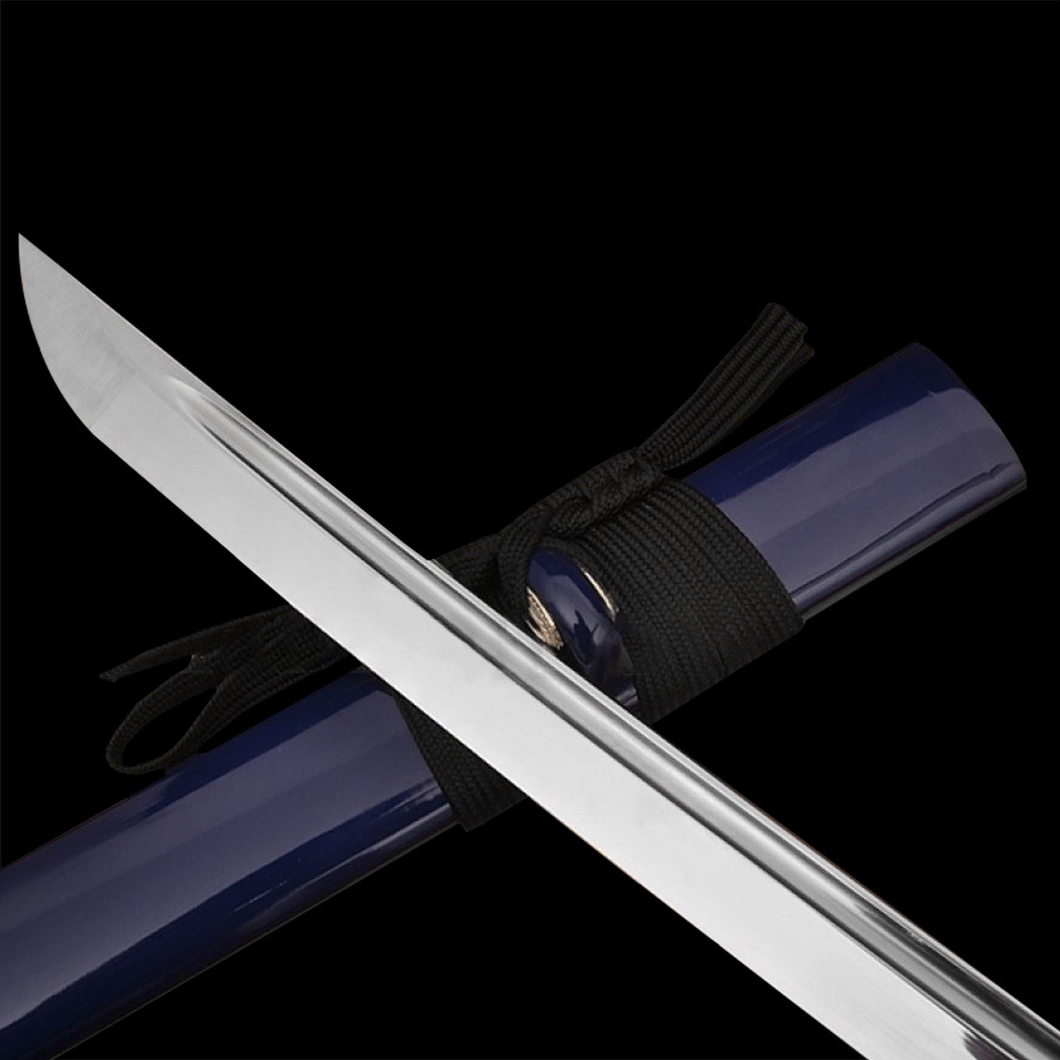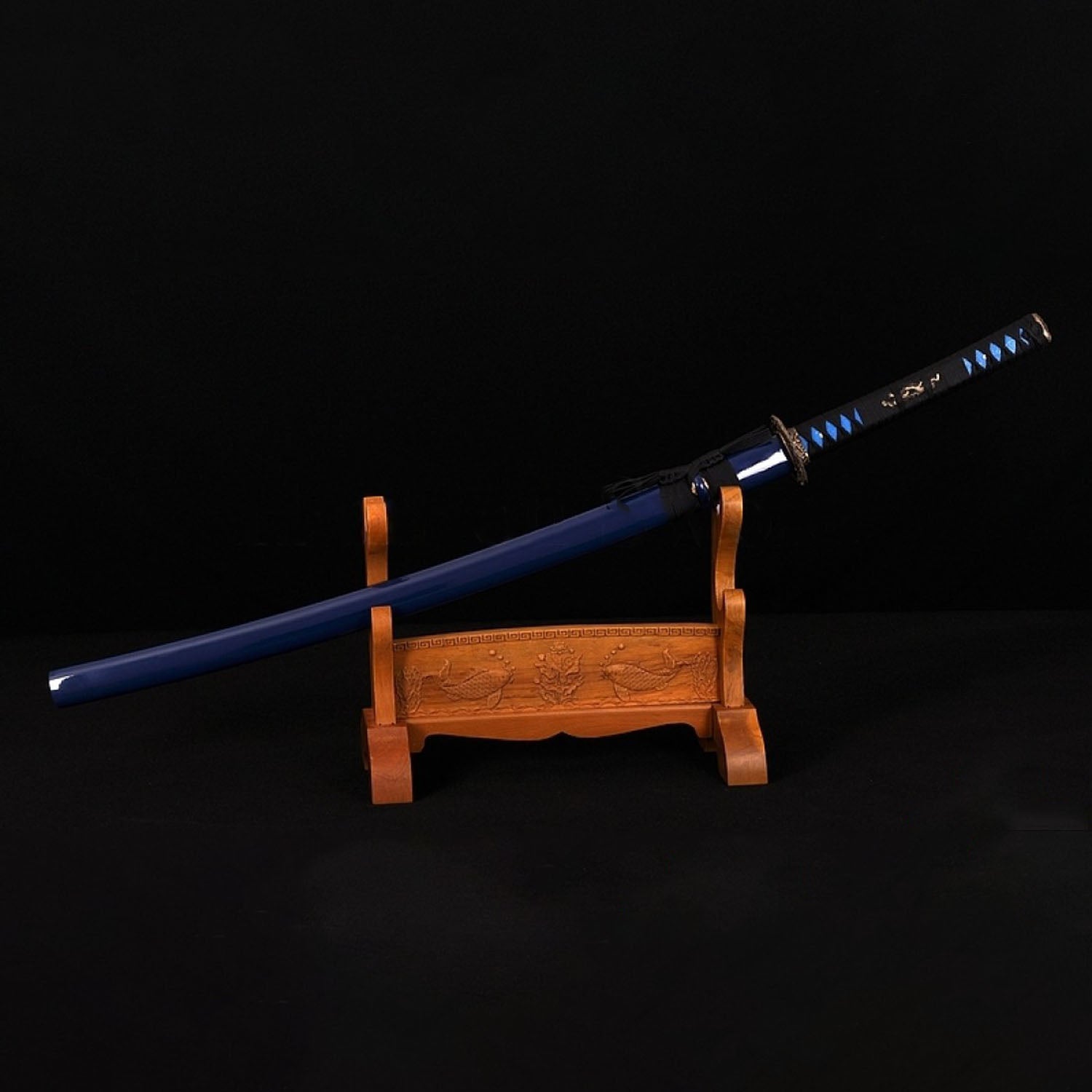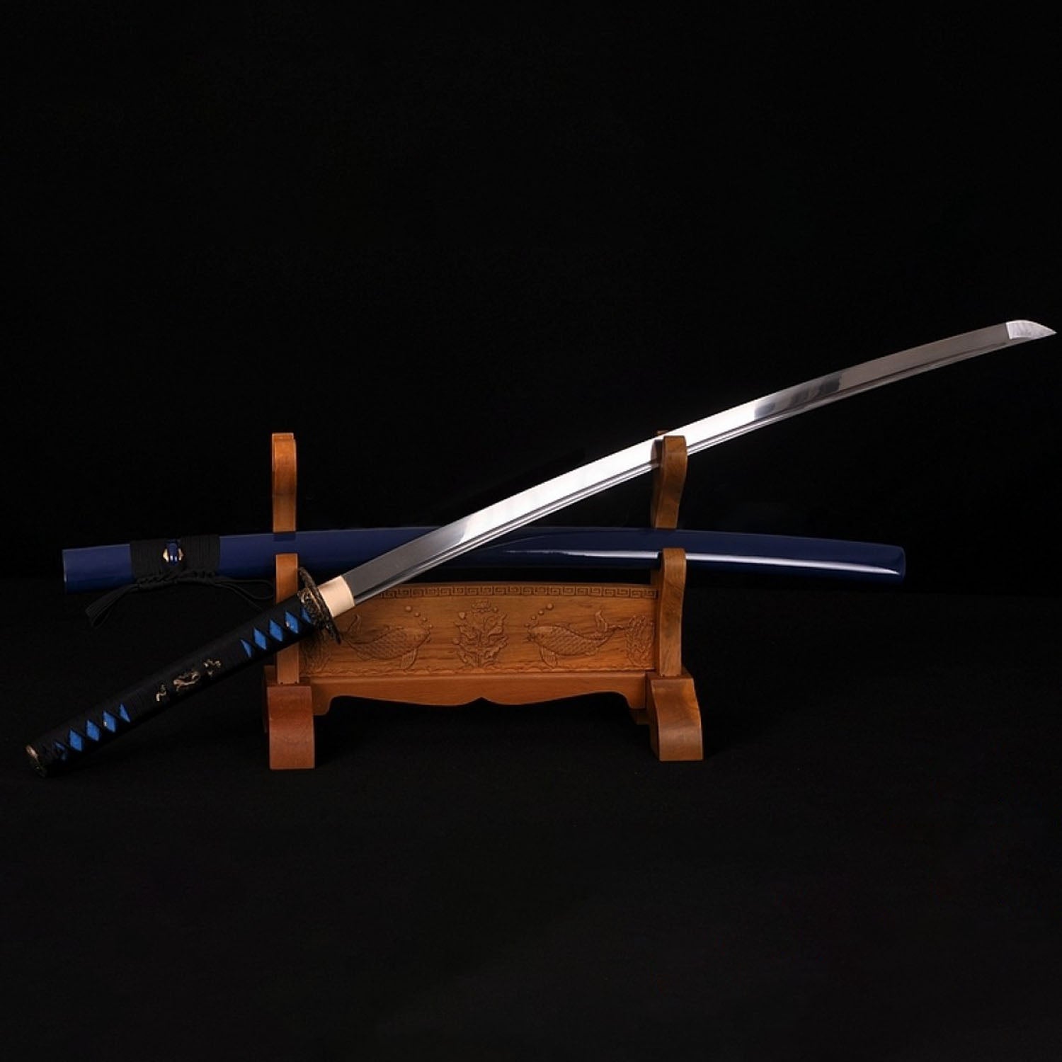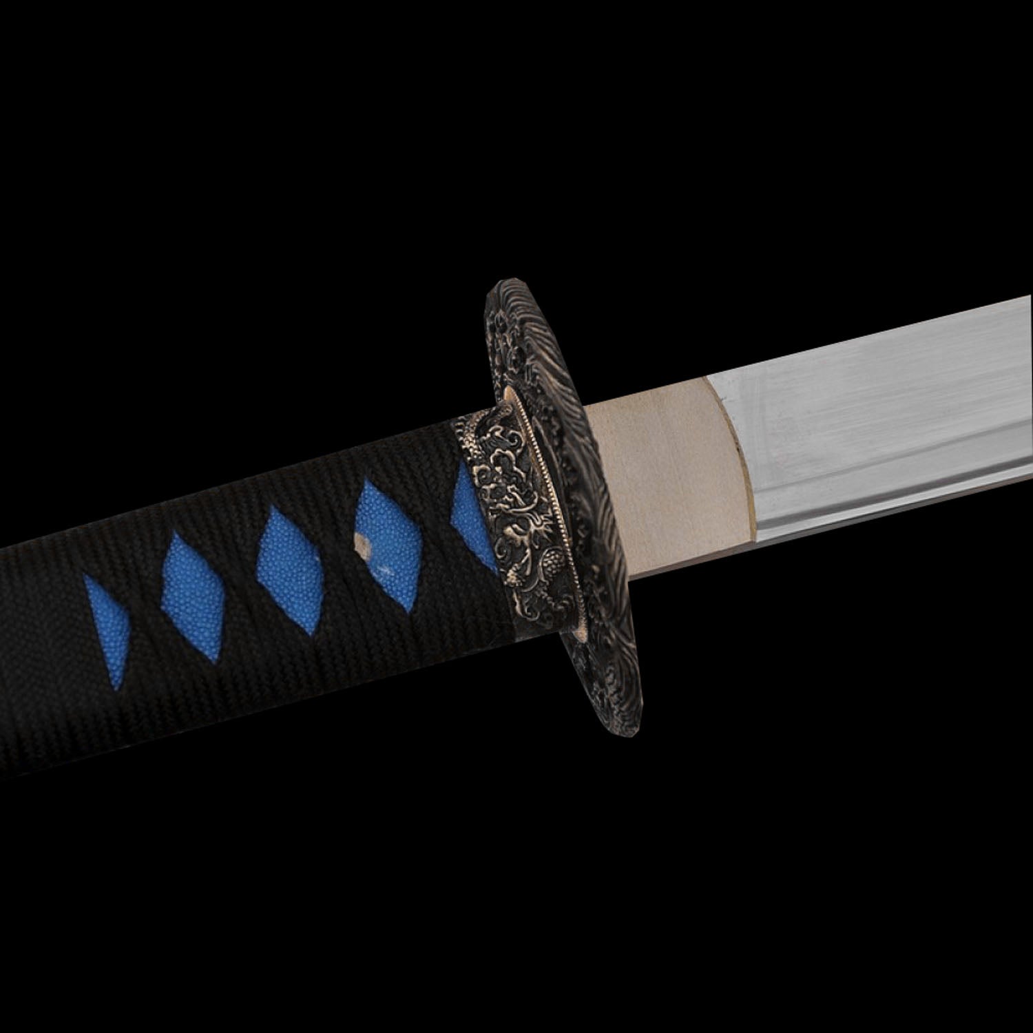The Sea Dragon Katana features a 1060 high-carbon steel blade, fully hardened through oil tempering. The blade undergoes a meticulous 12-step hand-polishing process, creating a mirror-like surface. It is designed with long BO-Hi on each side, reducing weight and providing audible feedback when swung, while enhancing balance for optimal performance. The tsuka is tightly wrapped with black synthetic silk ito over blue genuine SAMEGAWA (ray skin), secured with double bamboo pegs. The menuki display a dragon motif, and the tsuba is a round, blackened alloy piece featuring a sea dragon design. The saya is finished in a stunning blue gloss that extends the full length of the scabbard, and the sageo is made of synthetic silk.