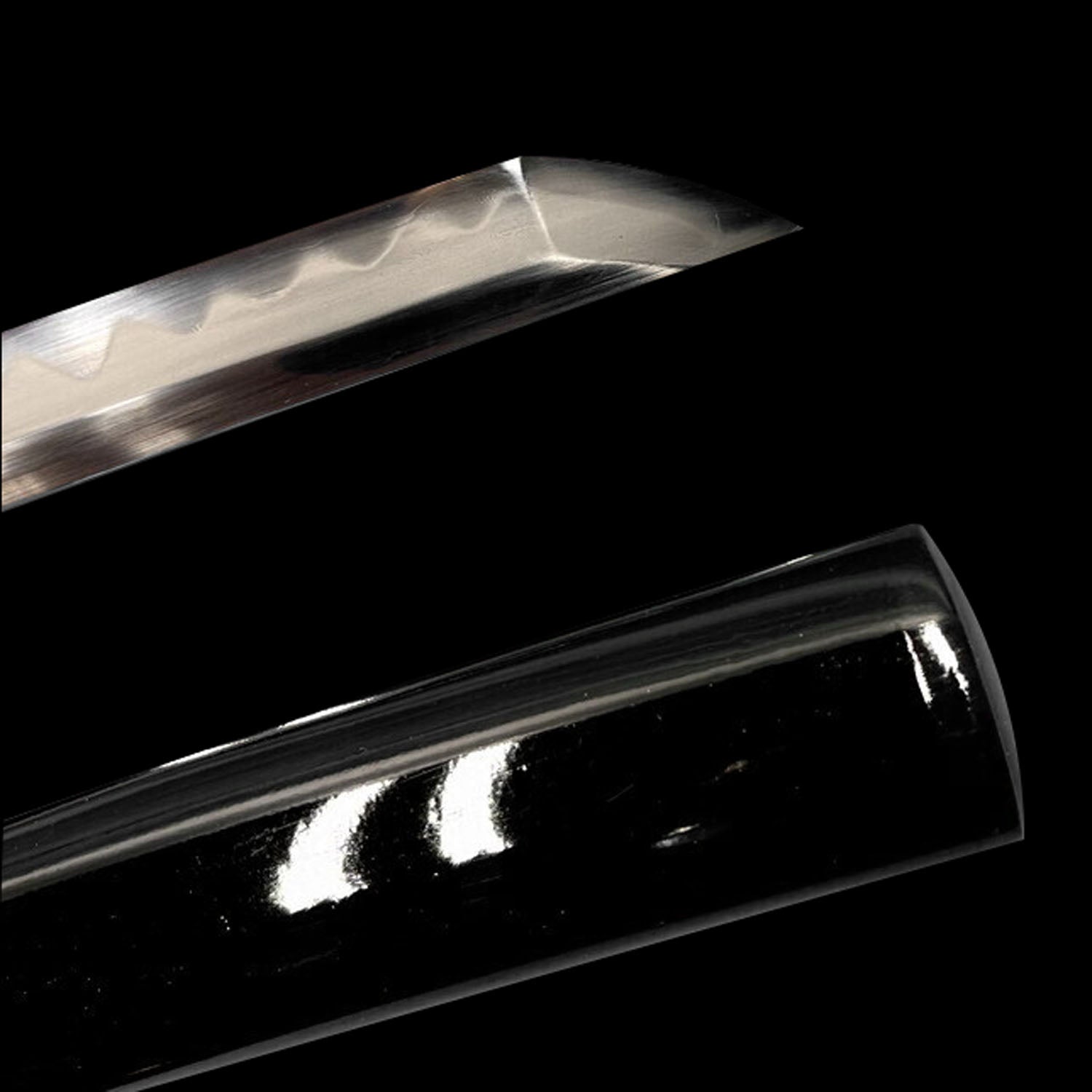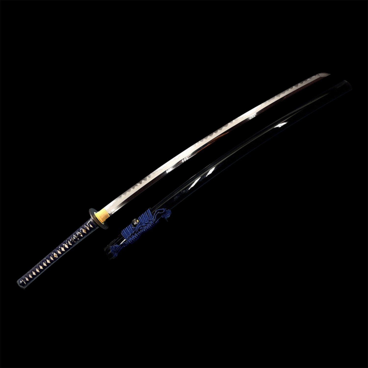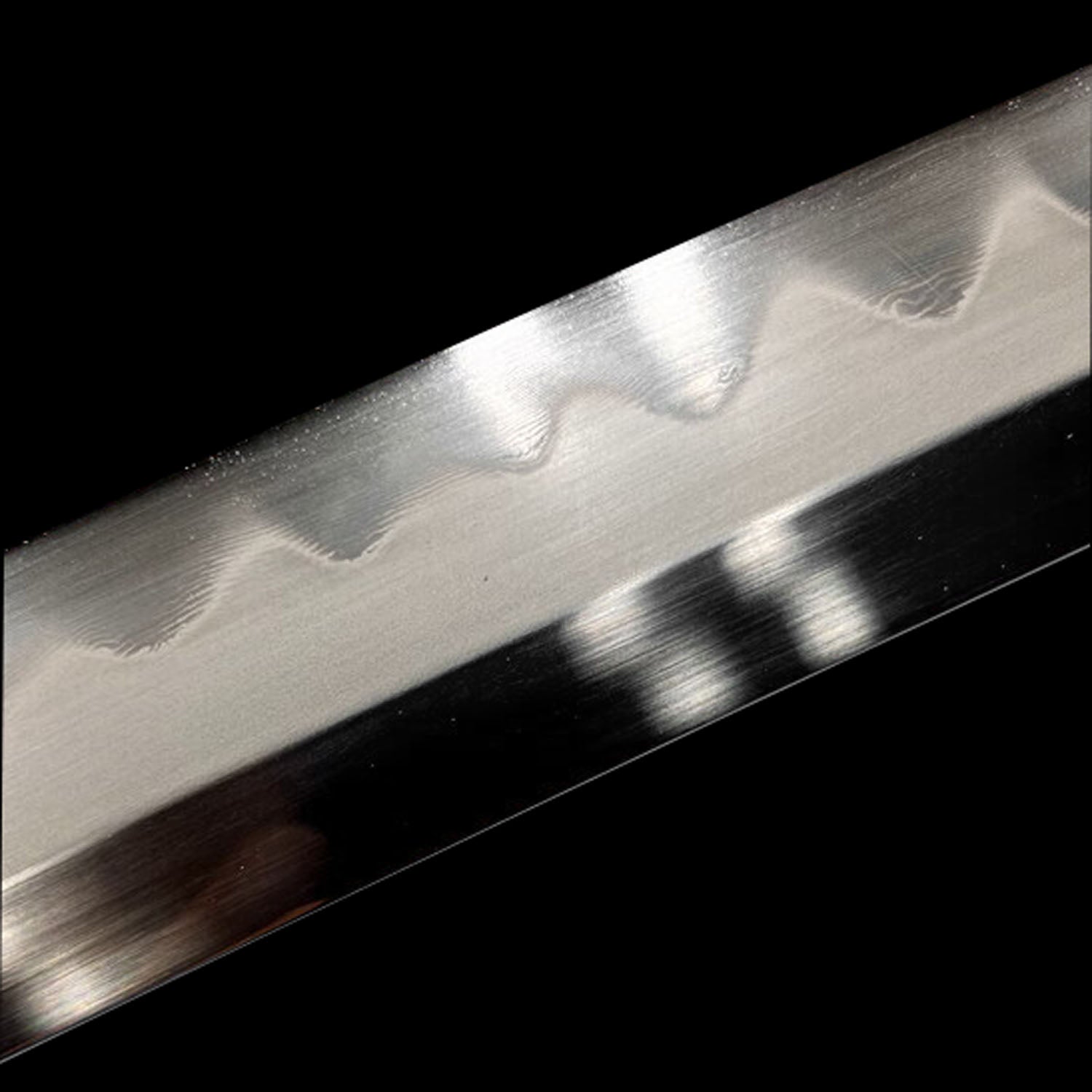 This katana is crafted for tameshigiri, featuring a robust blade without bohi, designed for powerful cutting practice. The hand-forged T10 steel blade showcases a gunome hamon with a geometric yokote, with a full hand-polished finish that makes the hamon prominent and visually striking.