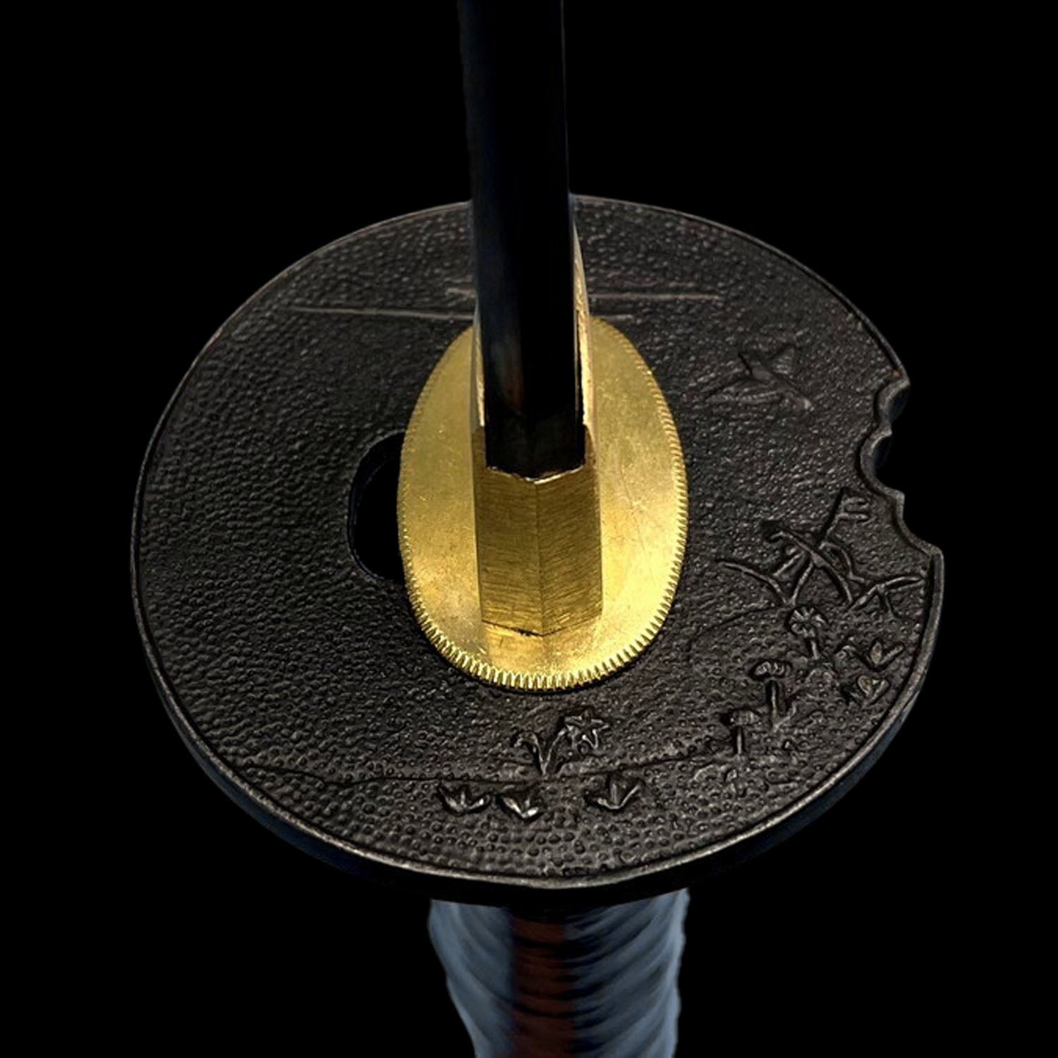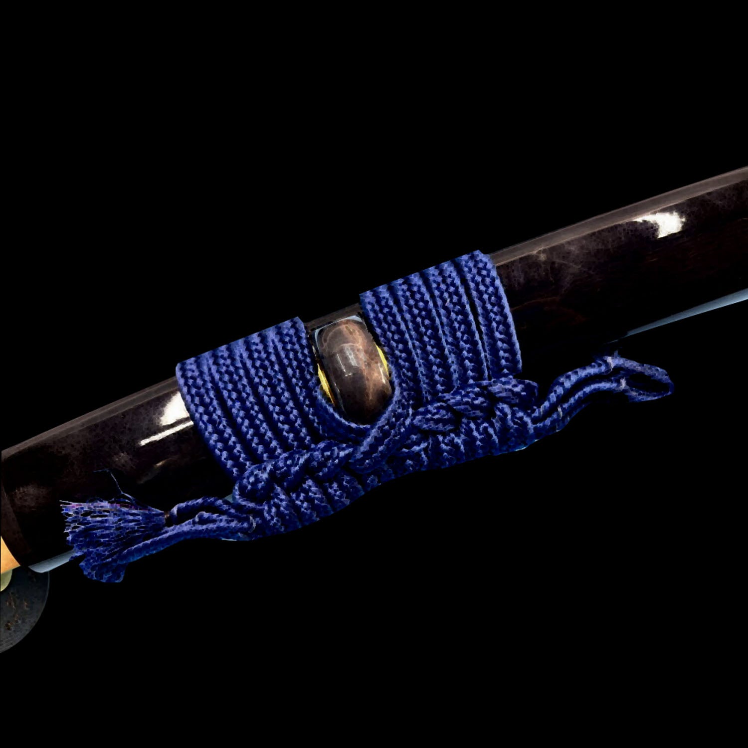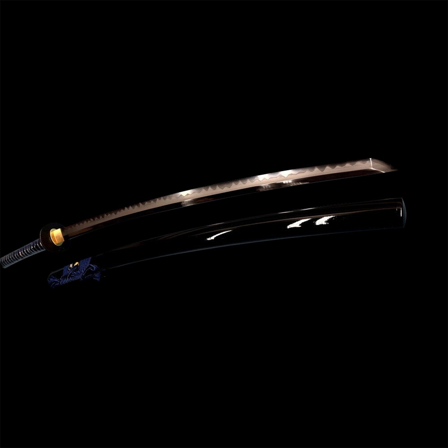This katana is crafted for tameshigiri, featuring a robust blade without bohi, designed for powerful cutting practice. The hand-forged T10 steel blade showcases a gunome hamon with a geometric yokote, with a full hand-polished finish that makes the hamon prominent and visually striking.