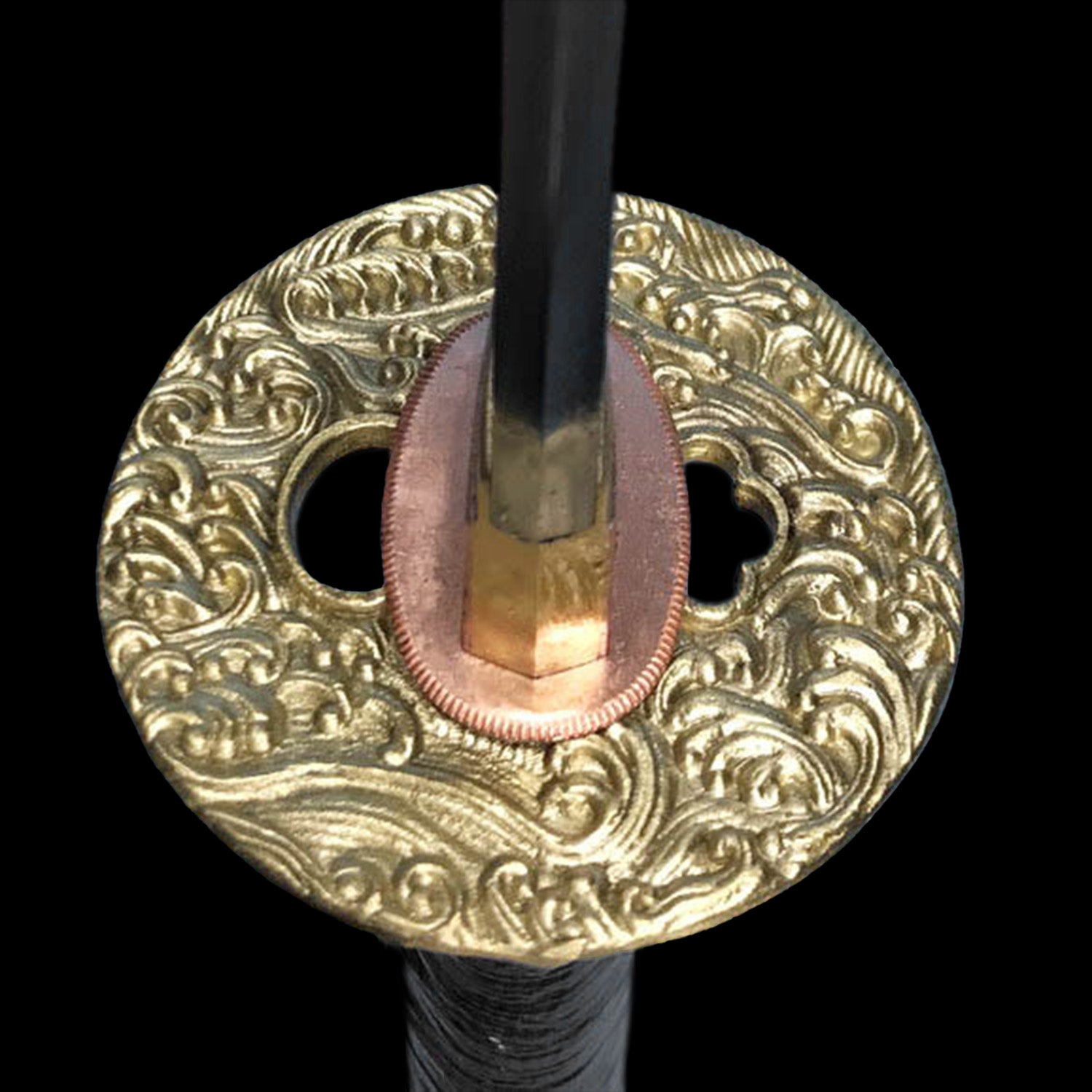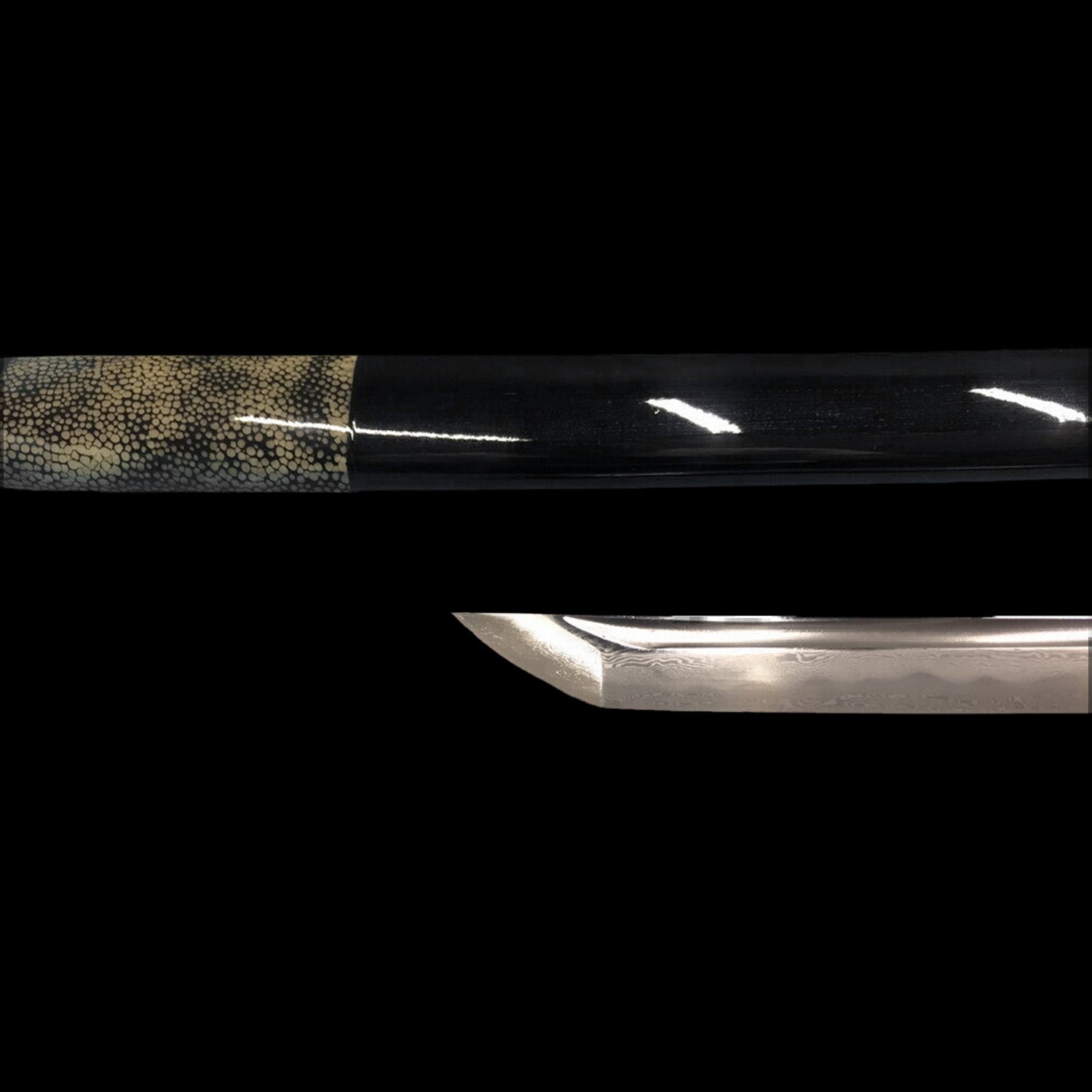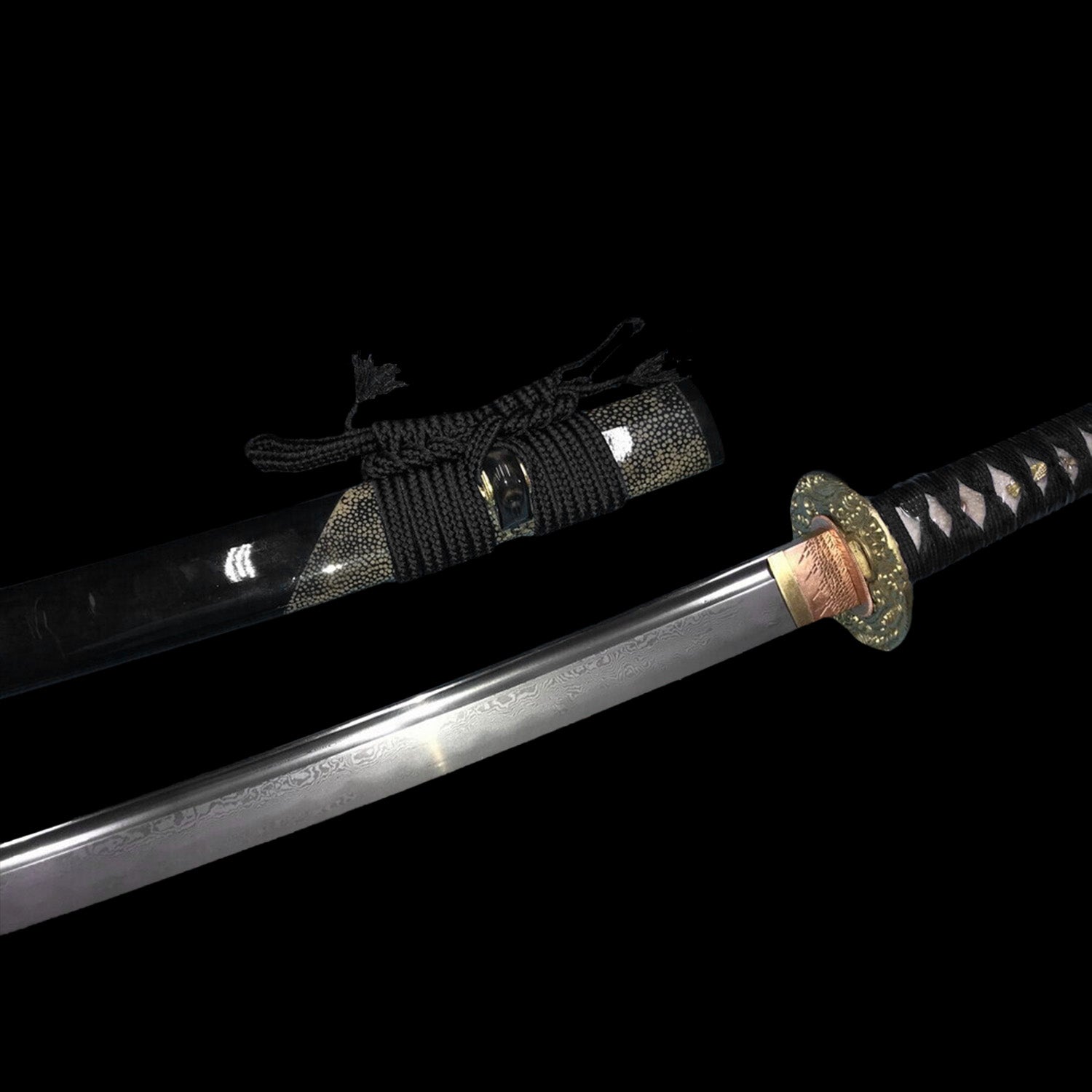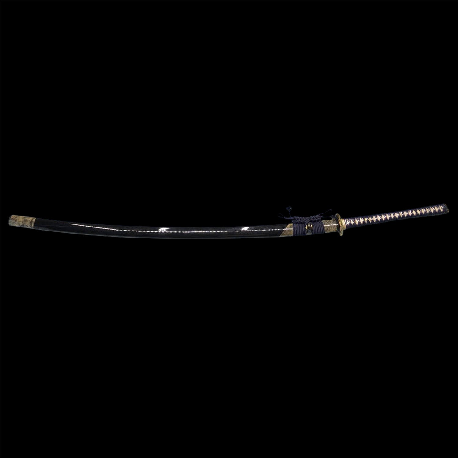The 38" long blade is forged and folded in T10 steel and differentially tempered; the Hamon is also hand polished. The long tang is double-pegged for security. The stunning Tsuba is made of a brass with a "tsunami" design and brass habaki. The saya is finished in a deep black lacquer with partial rayskin wrapped.